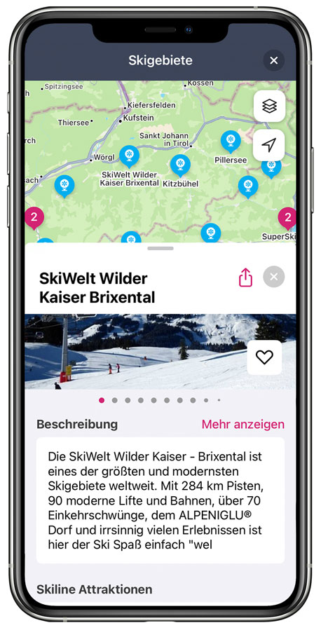 Am Ende eines Skitags einen Leistungsüberblick bekommen: Entweder auf der App oder als Ausdruck an einem der Skiline-Terminals an der Piste. Dokumentiert werden zurückgelegte Höhenmeter, Pistenkilometer, Geschwindigkeiten und Liftfahrten. In einigen der über 350 angeschlossenen europäischen Skigebiete lassen sich über die App professionelle Videos eigener Abfahrten filmen. Auch Speedfahrten samt Foto sind auf speziellen Pisten möglich. Darüber hinaus liefert die App Infos über geöffnete Lifte, Wetter und Veranstaltungen im Skigebiet.