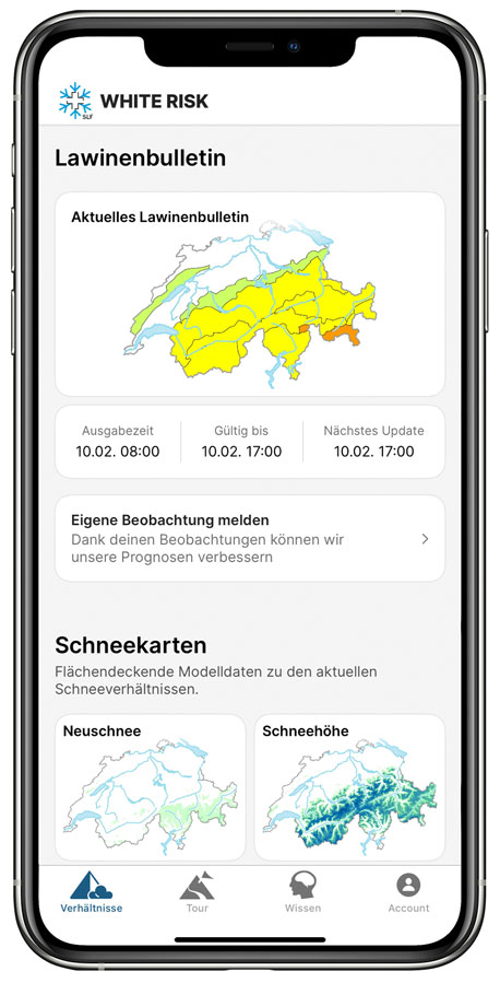 Die offizielle App des Schweizer Institut für Schnee- und Lawinenforschung (SLF) bietet aktuelle Lawinengefahr-Informationen sowie Angaben zur Schnee- und Wetterlage in Schweizer Skigebieten. Alles ergänzt mit Hintergrundwissen zu Lawinen. Obendrauf gibt es Tipps für die Planung von Skitouren, Schneeschuhwanderungen und Freerides. Ein Neigungsmesser ermöglicht es, aus der Ferne einzuschätzen, wie steil ein Hang ist.