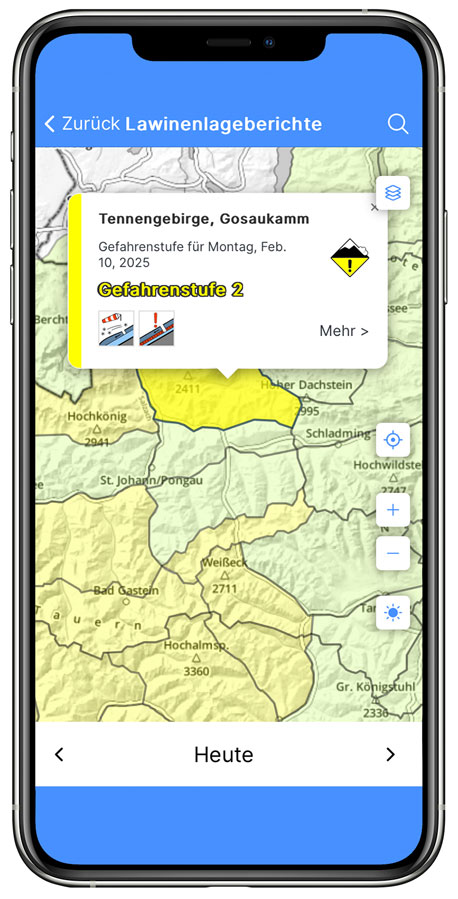 Auch die Lawinenwarndienste von Bayern und Österreich bieten eine Lawinen-App für ihre Wintersportgebiete. Sortiert nach Regionen präsentieren sie aktuelle Lawinenberichte inklusive Prognosen und Wettervorhersagen für die kommenden Tage. Beim Start der App werden die aktuellen Lawinenberichte heruntergeladen, sodass sie auch offline bereitstehen. Auch diese App integriert einen Neigungsmesser zur Bewertung der Lawinengefahr.