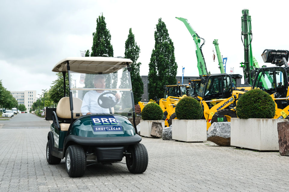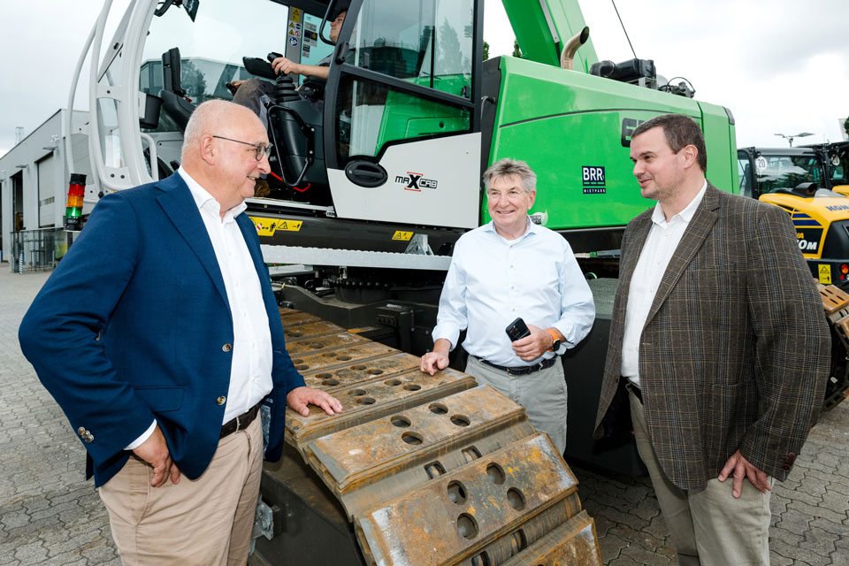 Bei den gelben und grünen Baumaschinen, die auf dem Firmengelände bereitstehen, herrschen nach wie vor Dieselmotoren vor. Wobei PS-Zahlen in der Branche völlig uninteressant sind, sagt Harald Ausmeier: „Da kommt es auf Aspekte wie Hakenhöhe und Tragkraft an.“ Wie beim „Sennebogen 653“, einem Telekran, der gerade an den Besuchern vorbeifährt. Er hebt 50 Tonnen etwa 30 Meter hoch. An diesem Tag hat er die eher leichte Aufgabe, ein Metallgestell mit dem BRR-Firmenlogo so hochzuhieven, das man es als Landmarke auch von der nahegelegenen Autobahn aus sehen kann.