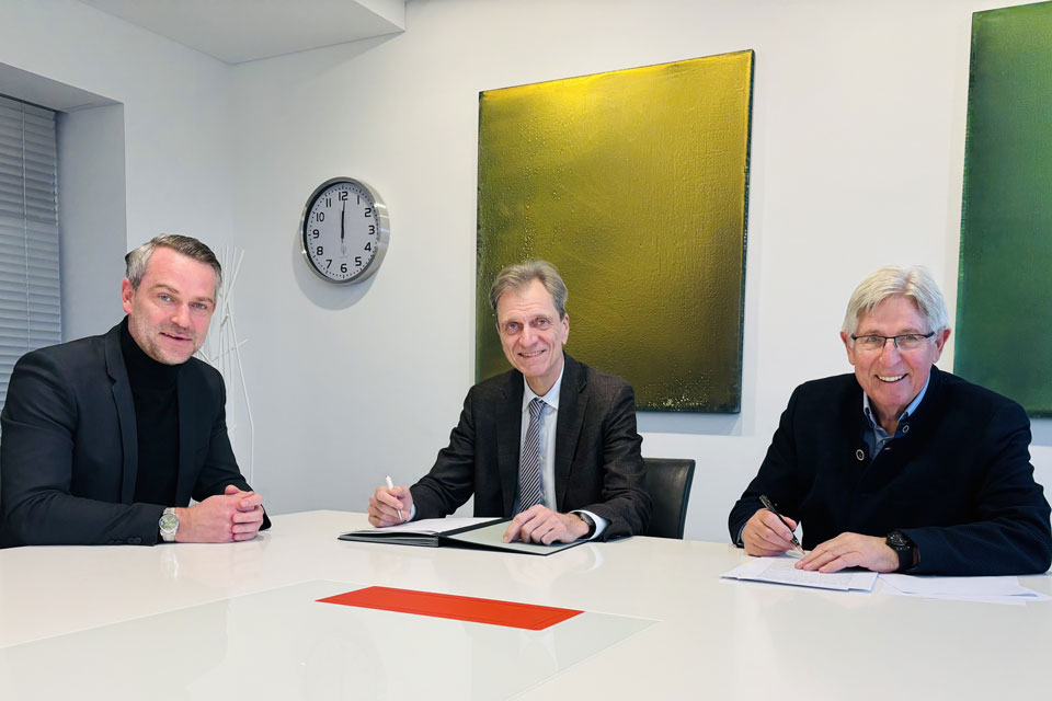 Paul Elles, ehemaliger Geschäftsführer und Anteilseigner der S. Elles & Co GmbH (r.) und Stadtwerke-Vorstand Ulrich Koch (Mitte) besiegeln die Übernahme. Patrick Elles (l.) wird den Rohrleitungsbauer als Geschäftsführer in Datteln weiterleiten.