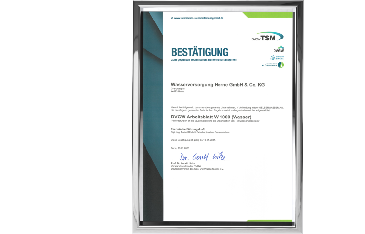 Die Wasserversorgung Herne GmbH & Co. KG hat im November 2025 erneut erfolgreich die sogenannte TSM-Zertifizierung bestanden.