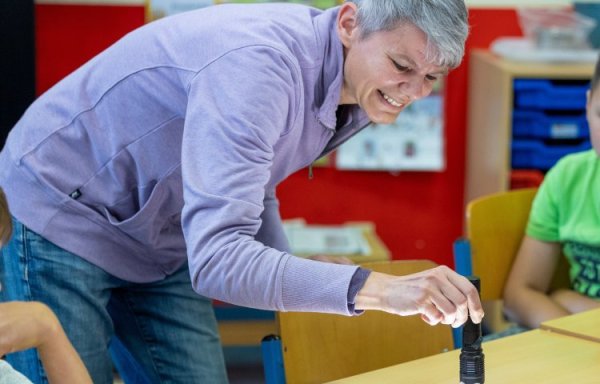 Die Klasse 4a hat während des Unterrichts viel gelernt und kann problemlos zwischen fossilen und erneuerbaren Energien unterscheiden. Sie verstehen, welche Energiequellen dem Klima besonders schaden. Nach einem theoretischen Teil durften die Kinder selbst aktiv werden: Sie stellten sich vor, der Wind zu sein, und brachten mit eigener Puste ein Rad zum Drehen, das ein kleines Licht zum Leuchten brachte. "Ganz schön anstrengend", lautete der einhellige Kommentar der Schülerinnen und Schüler. Mit Taschenlampen setzten sie kleine Solarautos und -skateboards in Bewegung und lieferten sich spannende Rennen auf den Schultischen.