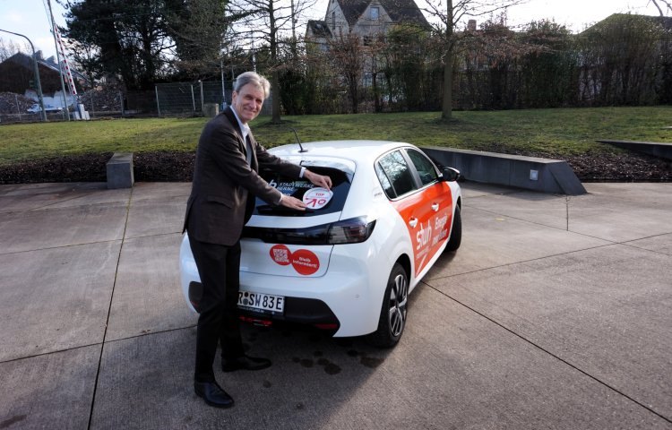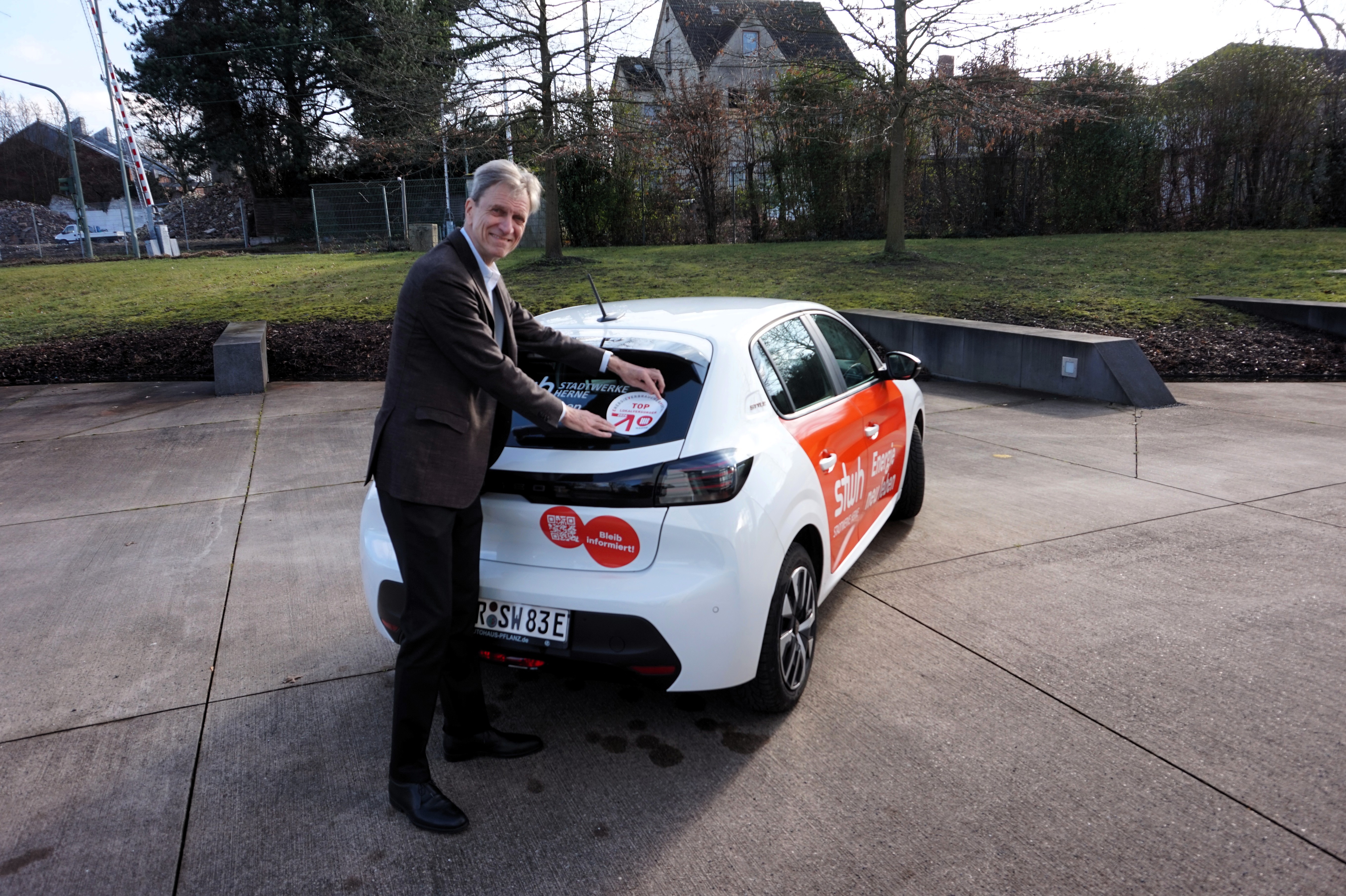 Ausgezeichnet! Vorstand Ulrich Koch präsentiert das TOP-Lokalversorger-Siegel am Stadtwerke-Elektroauto.